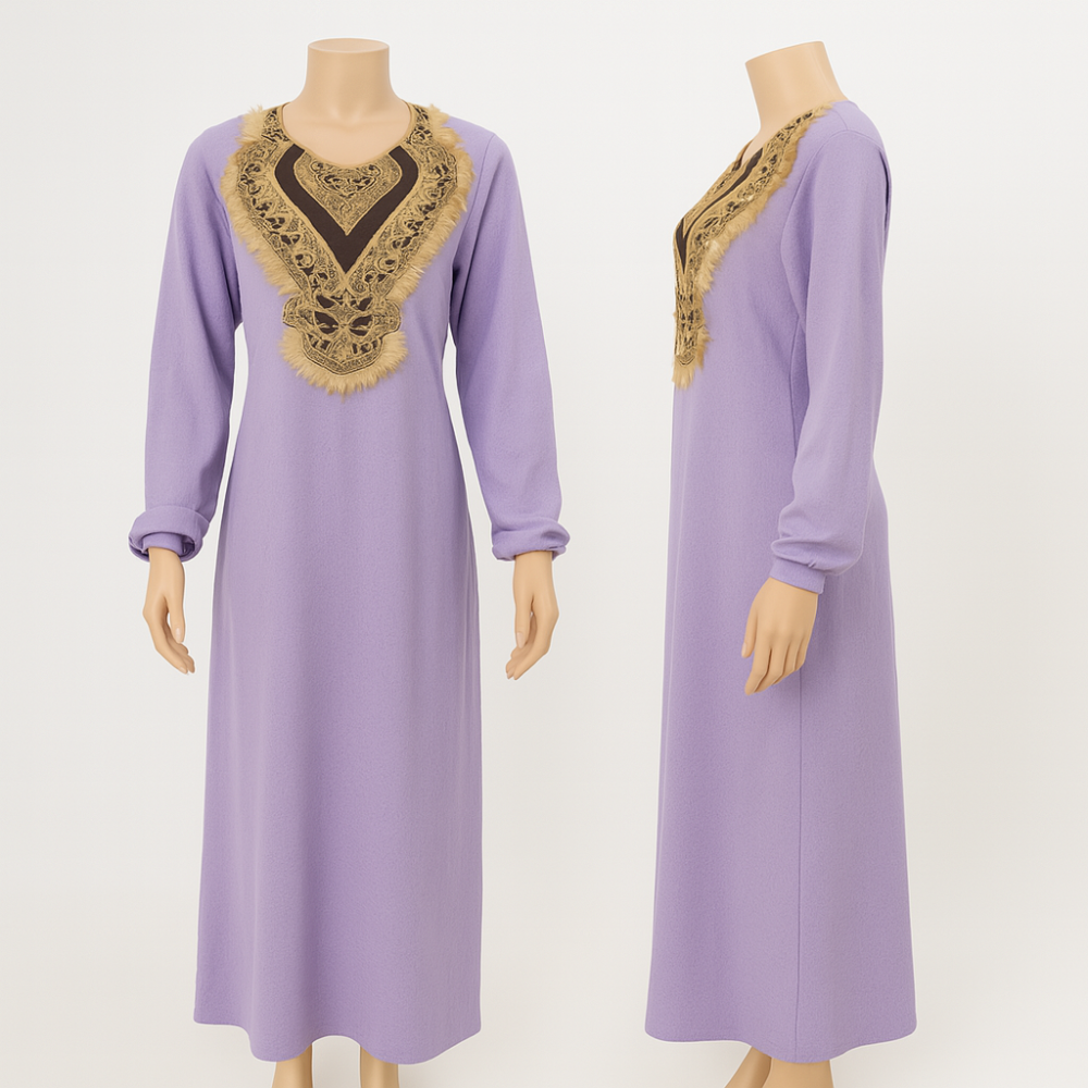 استمتعي بإطلالة راقية ومفعمة بالأنوثة مع جلابية سهرة طويلة موف ناعمة بتطريز وريش فاخر، التي تمنحك إطلالة ساحرة تجمع بين لمسة الفخامة والراحة المطلقة داخل المنزل.