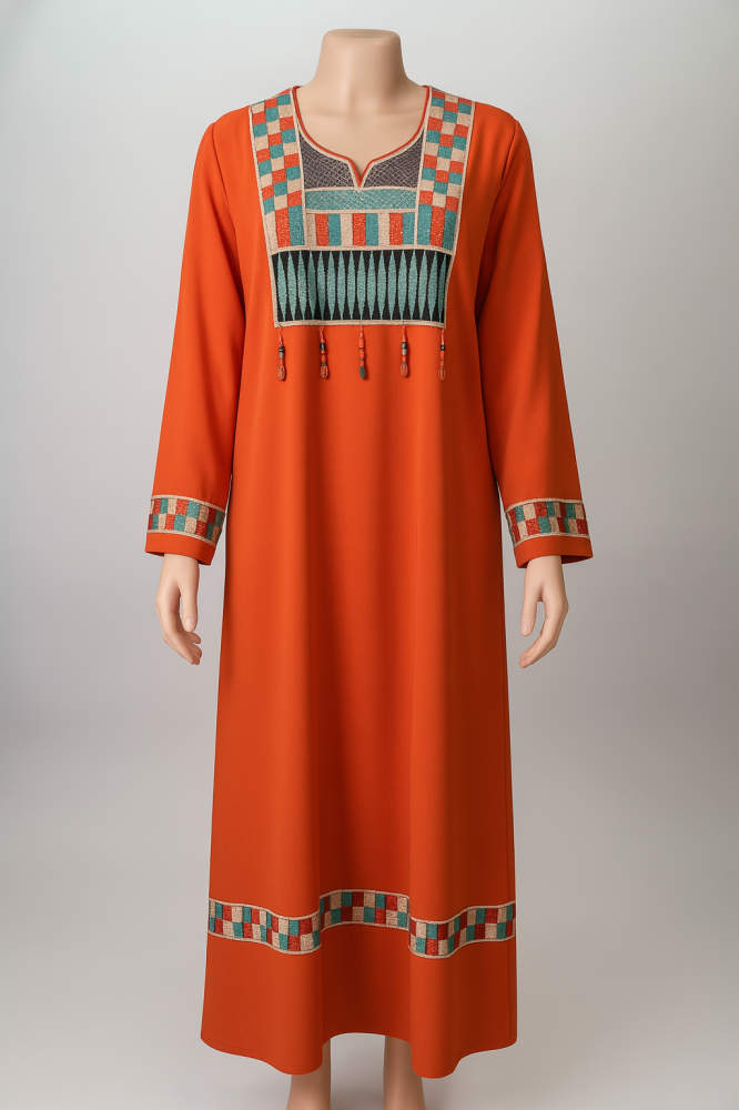 استمتعي بإطلالة فريدة تمزج بين الطابع التقليدي واللمسات العصرية، مع هذه الجلابية البرتقالية الطويلة التي تخطف الأنظار بتطريزها المميز على منطقة الصدر والحواف.