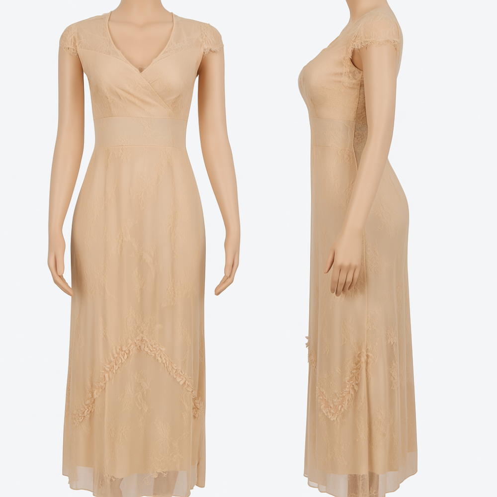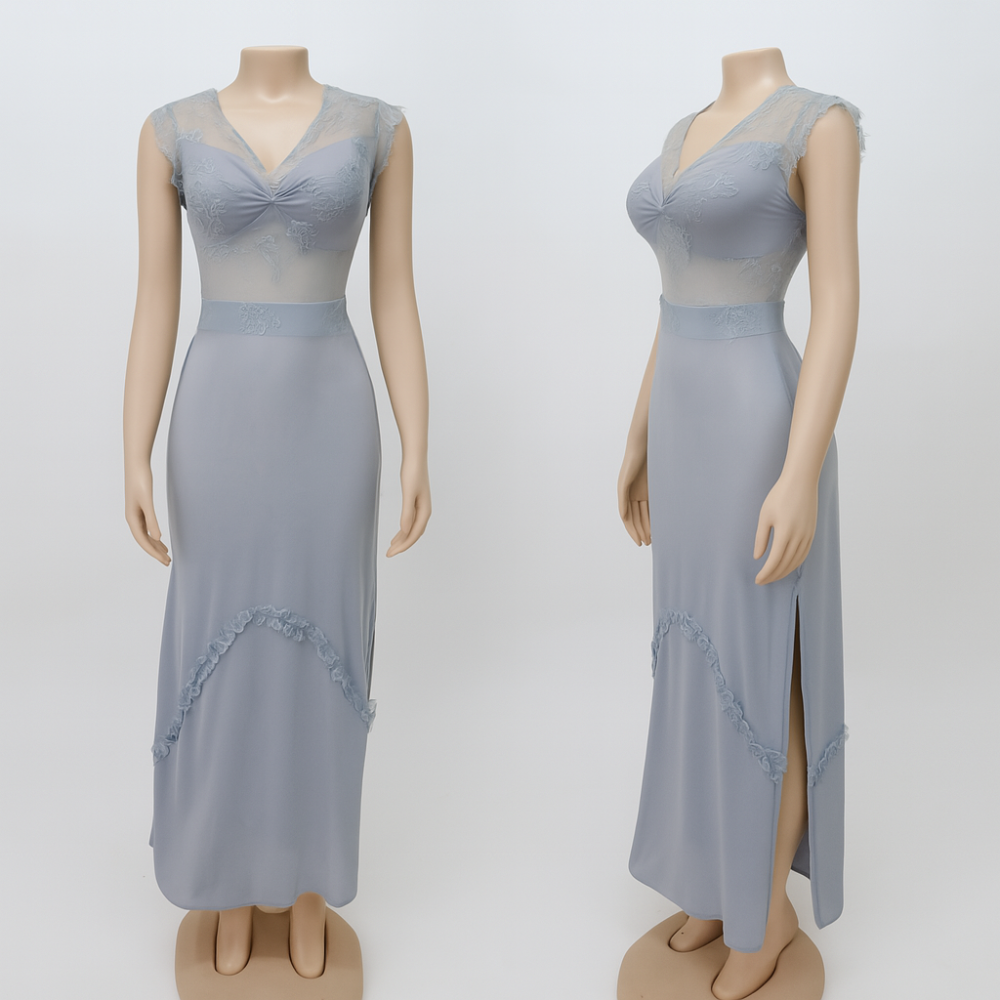 يتميز هذا الفستان الطويل بتصميم راقٍ وناعم، يجمع بين الرقة والأنوثة في كل غرزة. الجزء العلوي مصنوع من قماش شفاف مطرز بنعومة، ينسدل بانسيابية على الجسم ليمنحك مظهراً جذاباً ومحتشماً في آنٍ واحد. تصميم الأكمام الشفافة مع لمسات الدانتيل يضفي لمسة حالمة تنبض بالأنوثة، أما الخصر المحدد فيبرز جمال القوام بإتقان.