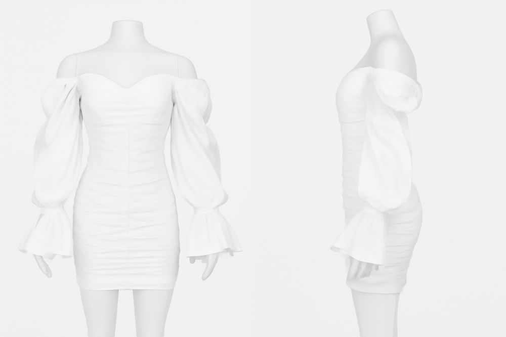 قصة الفستان ضيقة ومجعدة (ruched) لتعزز شكل الجسم وتُبرز القوام بأناقة.