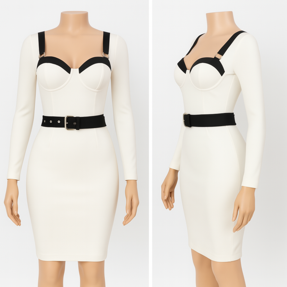- حزام خصر أسود قابل للتعديل يُبرز خصرِك بأناقة ويخلق تباينًا ملفتًا مع البياض الناصع.