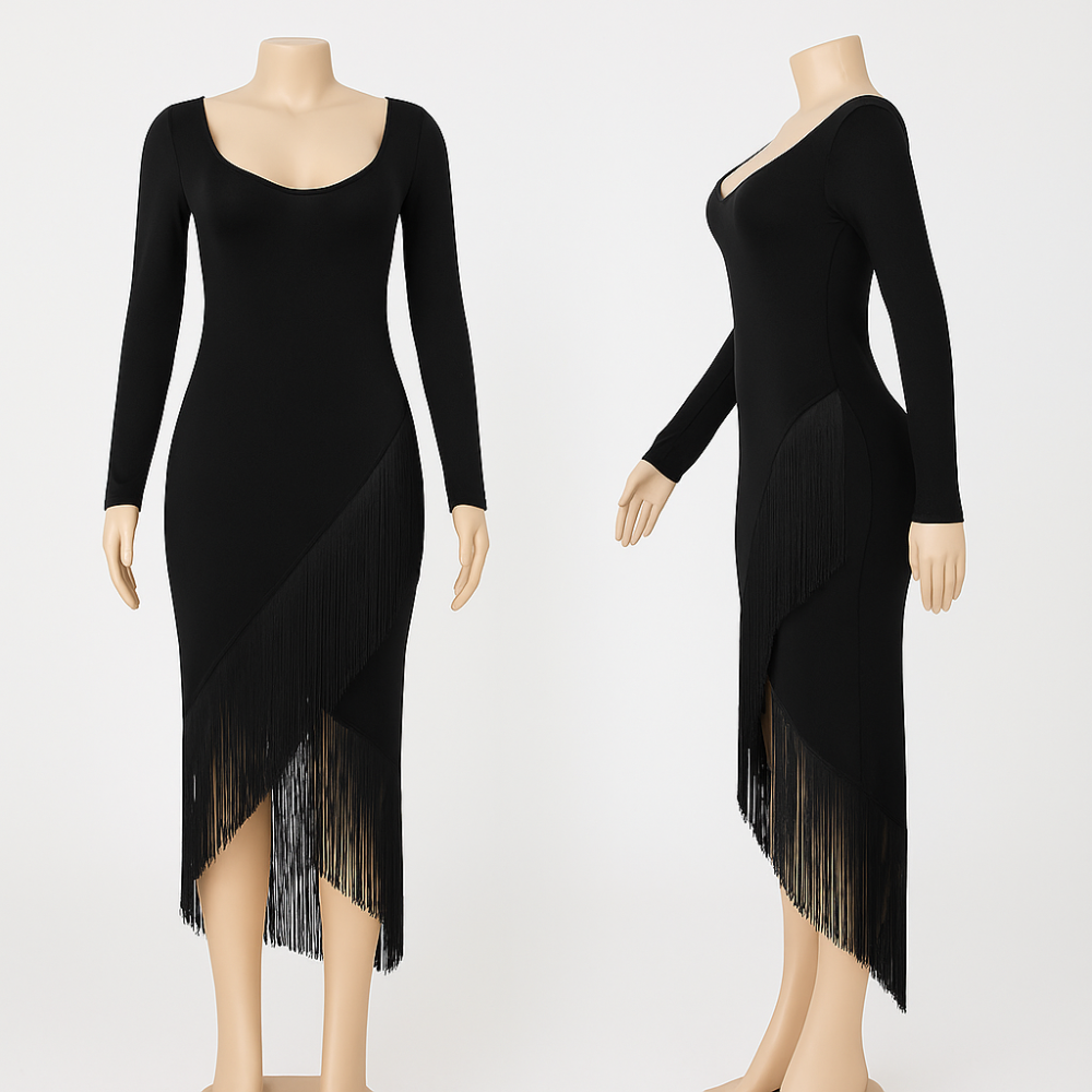 فستان سهرة أسود بكسرات شرابة