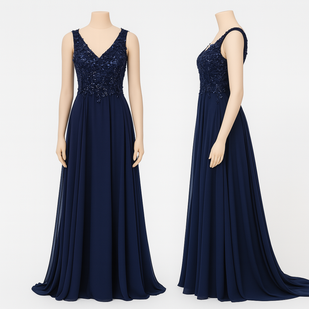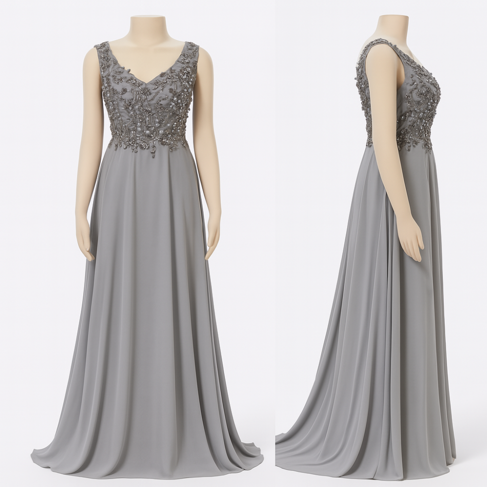 - القصة: فستان طويل بقصة A-Line تضيق عند الخصر ثم تنسدل بانسيابية حتى الأرض، فتبرز أنوثتكِ بمهارة وتمنحكِ حرية الحركة برشاقة.