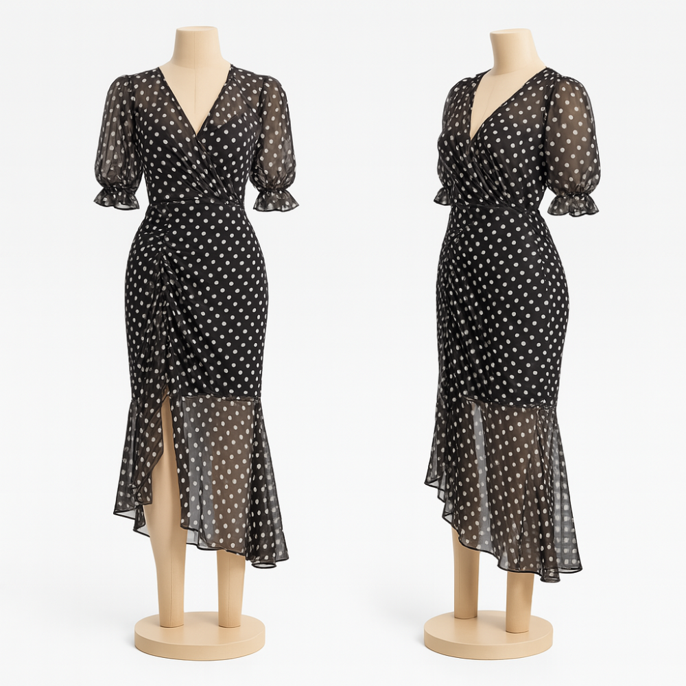 امنحي سهرتكِ رونقًا خاصًا مع هذا الفستان البديع المصمم بشيفون خفيف وزن يحمل نقوش النقاط البيضاء على خلفية سوداء، ليجمع بين الأنوثة والفرادة في إطلالة واحدة.