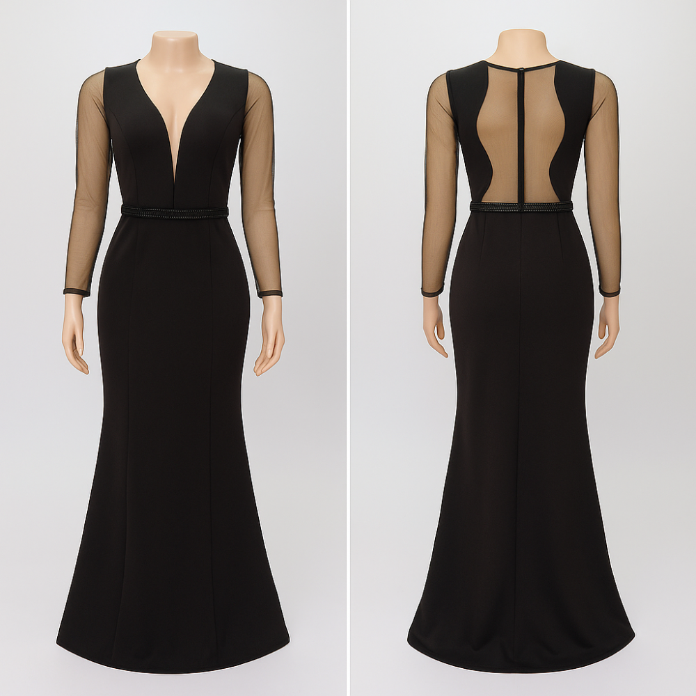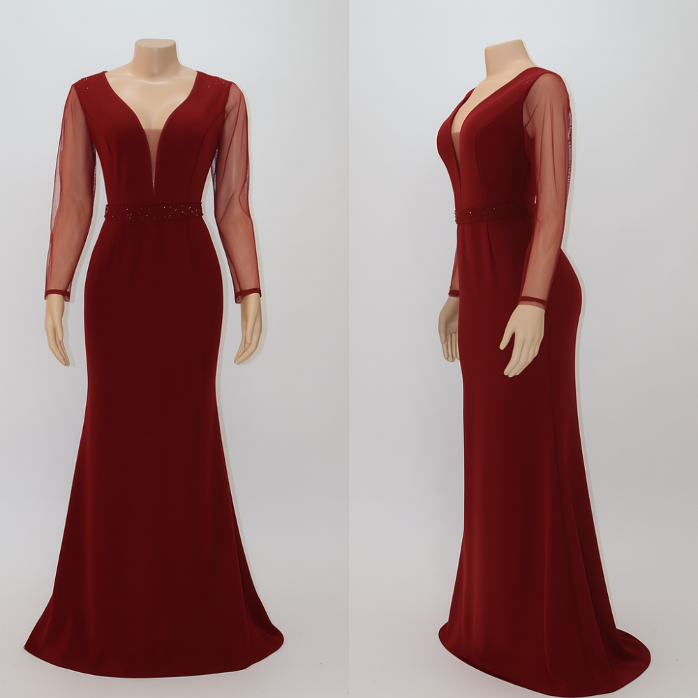 تم تصميم الأكمام الطويلة من قماش التول الشفاف لتعزيز الرقي والنعومة، مع لمسات دقيقة من الترتر تضيف بريقاً خفيفاً ومناسباً لأجواء السهرات. يتميز الخصر بحزام ناعم مرصّع يعزز الشكل ويمنحك طلة ممشوقة.