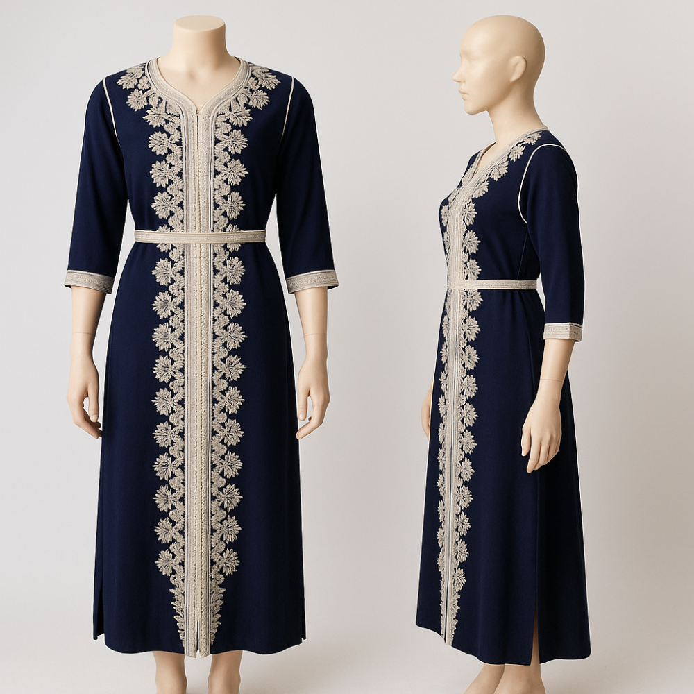 - التطريز: نقوش هندسية مغربية مزخرفة يدوياً تبدأ من فتحة العنق إلى الأسفل، تضفي لمسة فنية راقية.