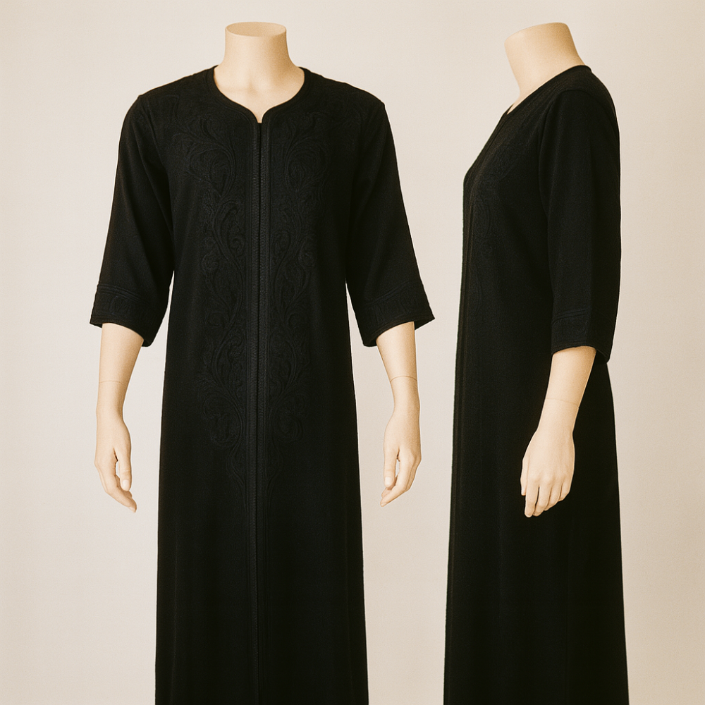 قفطان مغربي طويل ناعم مطرز باللون الأسود
