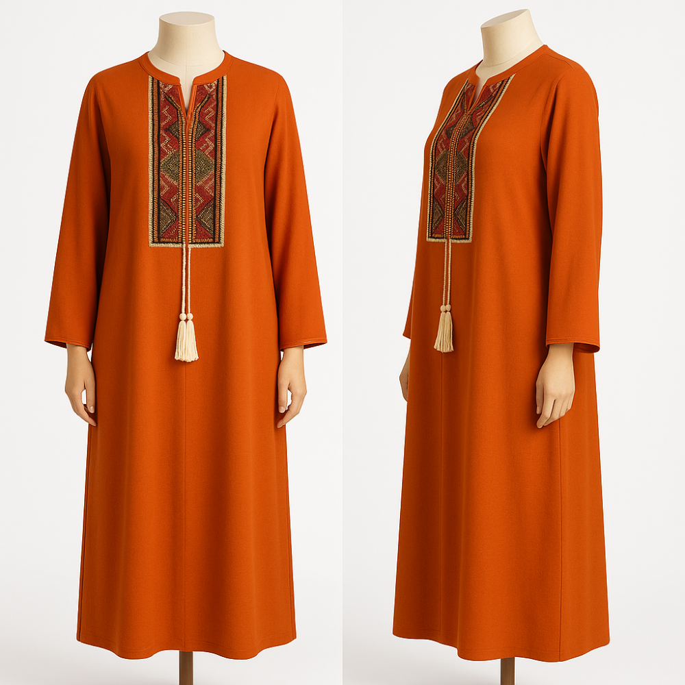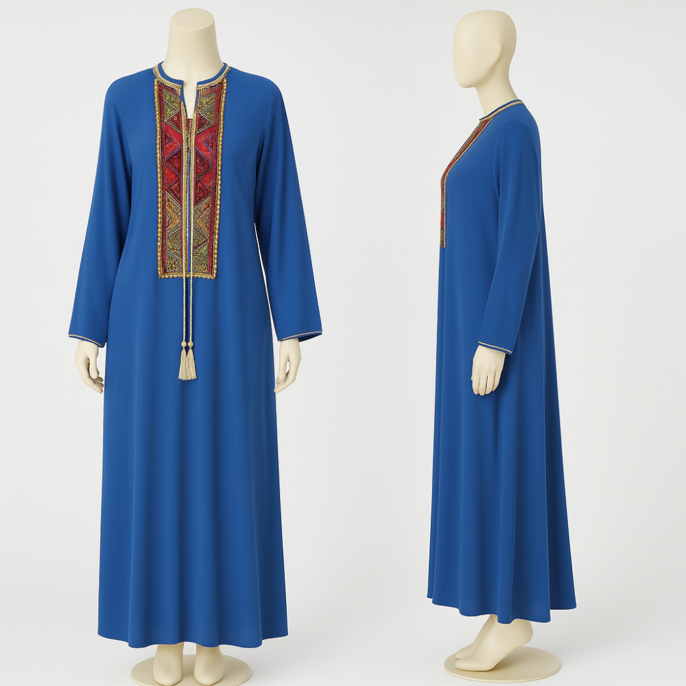 • التطريز والشراشيب: زخارف يدوية بتطريز دقيق على منطقة الصدر، تكتمل بشراشيب متدلية تضيف حركةٍ راقية وأنثوية لكل خطوة.