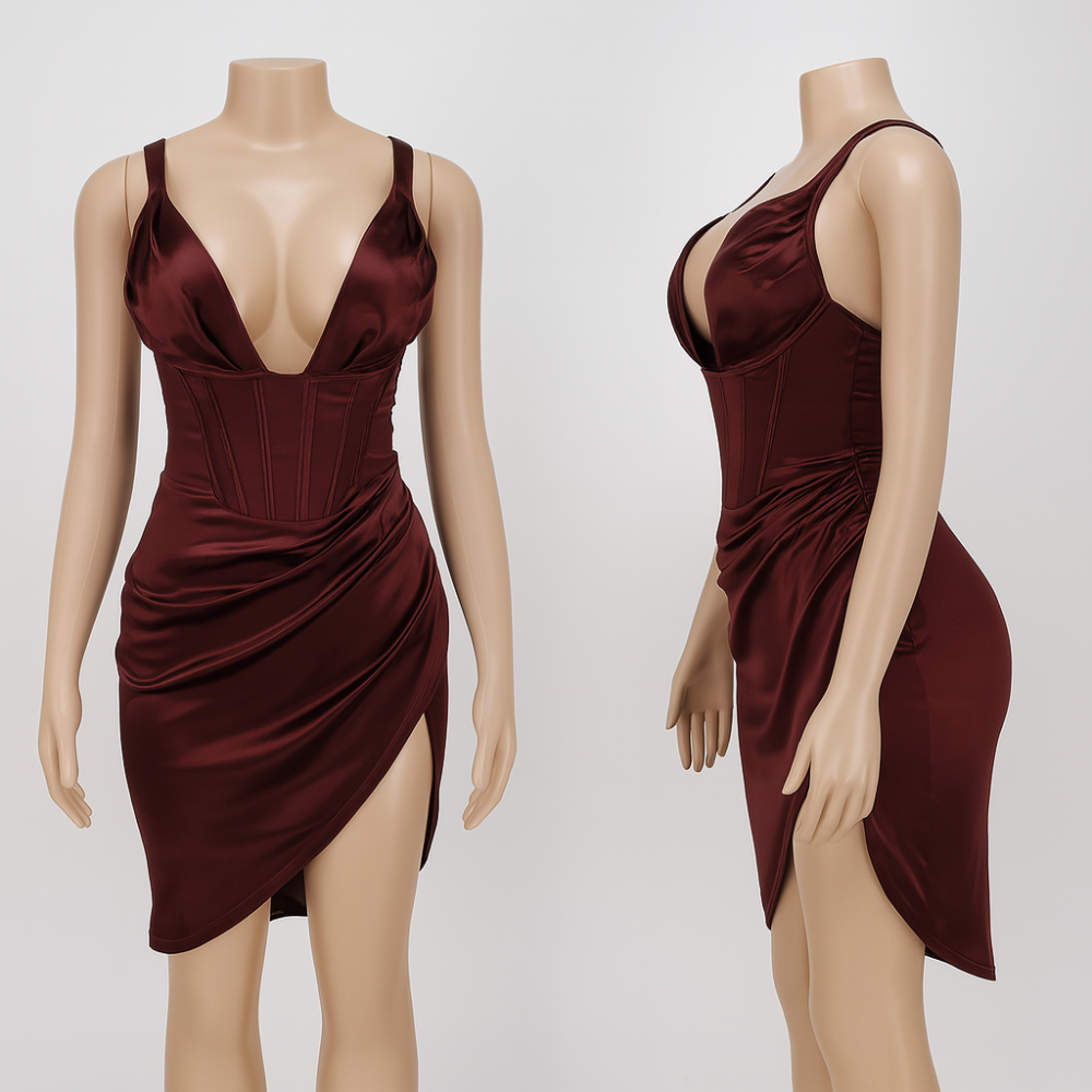 استمتعي بإطلالة تخطف الأنظار مع هذا الفستان القصير الساحر المصنوع من خامة الساتان اللامعة بلون بني ملكي غني. تصميم مثالي يبرز أنوثتك ويمنحك حضوراً مميزاً في كل سهرة.