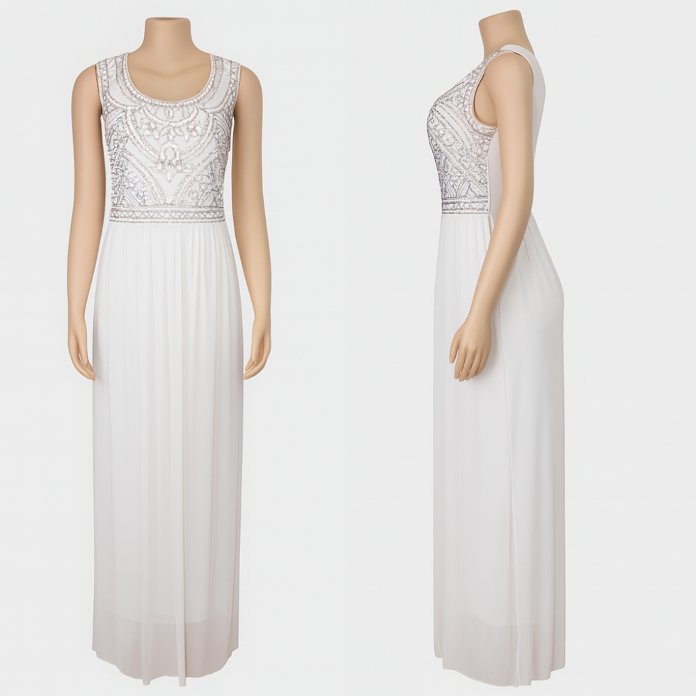 فستان طويل مصمم بقصة انسيابية تبرز جمال القوام، يتميز بصدّار مزين بتطريز دقيق ولامع يمنح الفستان طابعاً كلاسيكياً راقياً. القماش الانسيابي الناعم ينسدل بلطف ليمنحك شعوراً بالراحة والأناقة في آنٍ واحد. بدون أكمام، مع فتحة رقبة دائرية تضيف لمسة من الأنوثة.