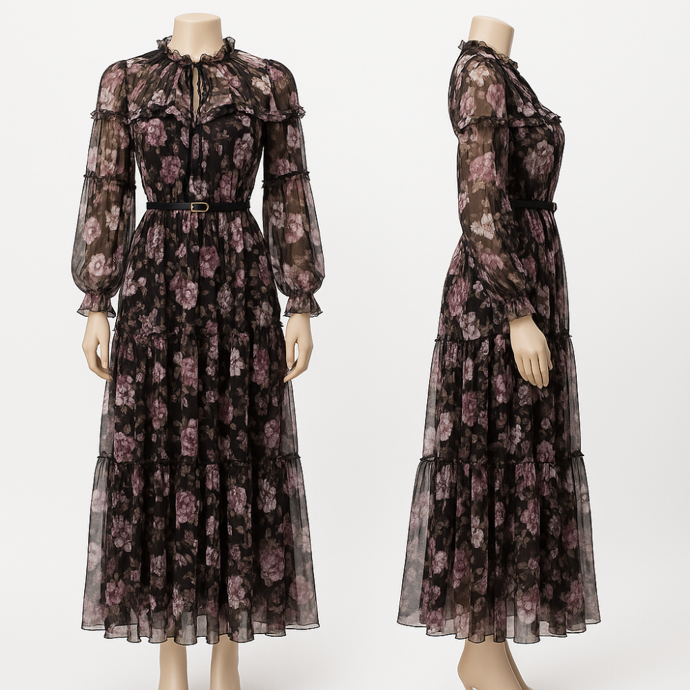 - قصة طويلة انسيابية (Maxi Dress): تنساب بطبقات شيفون شفافة تتدفق بخفة مع كل حركة.
