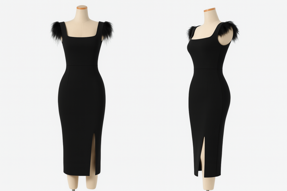 - ياقة مربعة رقيقة تبرز جمال عظام الترقوة وتنسجم مع تفاصيل الريش دون إفراط.