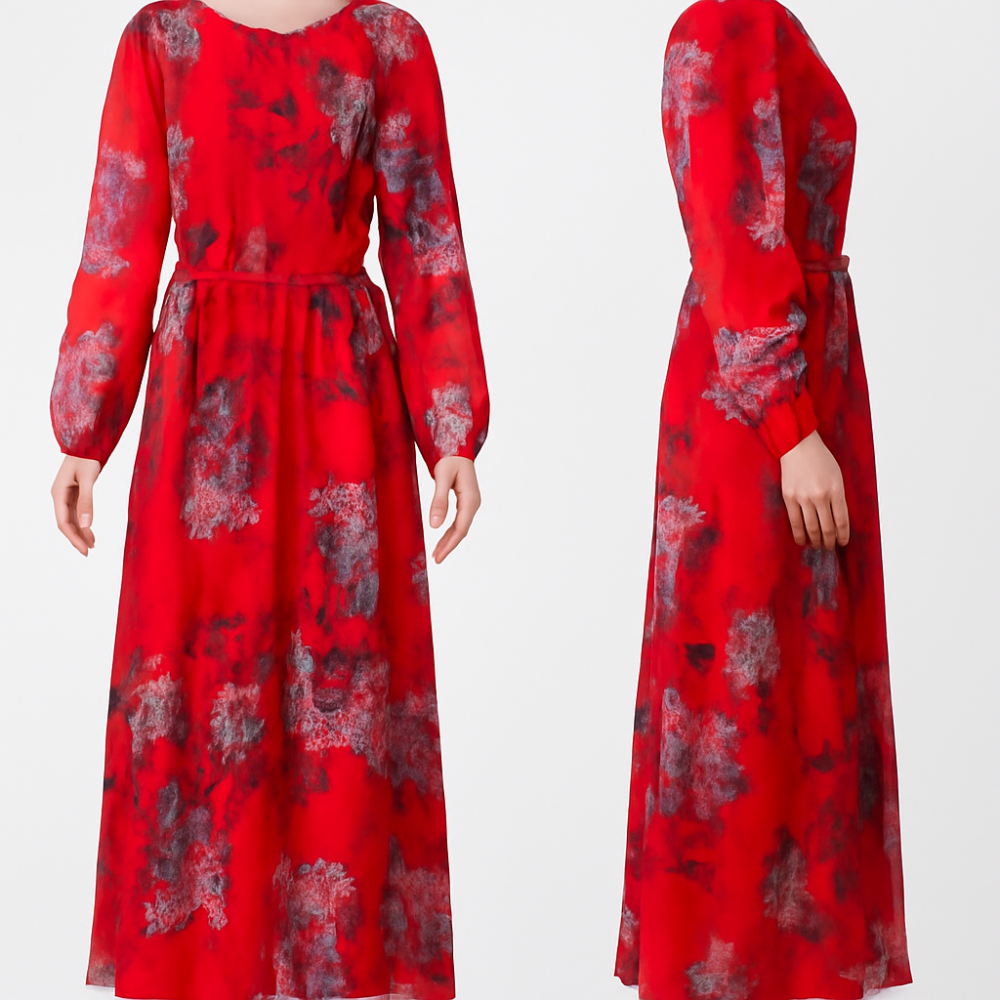 الفستان مصمم من قماش شيفون شبه شفاف، ما يضفي عليه لمسة من الرقة والنعومة. يتميز بتصميم الزهور الكبيرة والملونة باللون الأحمر، الأبيض، الرمادي، والأسود، التي تعطيه تأثيرًا مائيًا رائعًا. الفستان مزخرف بحزام ذات لون الفستان يتم ربطه حول الخصر لتحديده بشكل مثالي، مع تفاصيل الأكمام الطويلة ذات الكُم المنتفخ الذي يضفي على الفستان لمسة من الفخامة. كما أن التصميم يمنح إطلالة مريحة ومنعشة بفضل شكله المنسدل والمريح.